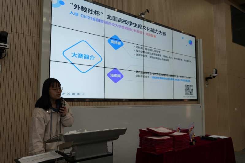 竞赛项目负责人李悦老师负责赛事解析主持工作。在活动中,外语教学部主任薛文隽以充分肯定参赛学生的努力与创意开场,接着,上海外语教育出版社跨文化能力测试中心专家柳源以“跨文化能力培养与赛事全景解析”为主题,为现场师生带来了一场深度讲座。柳源从大赛的背景与意义出发,详细解读了“坚定文化自信,增进国际理解”的主题理念,并逐一介绍了校赛、省赛及全国决赛的参赛要求与评分标准。她强调,跨文化能力是全球化时代人才的核心素养,鼓励学生通过比赛提升语言应用能力、文化敏感度及国际视野。随后,赛事主办方代表吴涵补充介绍了“外教社杯”大赛的权威性与影响力,指出其作为外语类学科竞赛的标杆,已连续多年入选中国高等教育学会竞赛目录,为高校人才培养提供了重要平台。