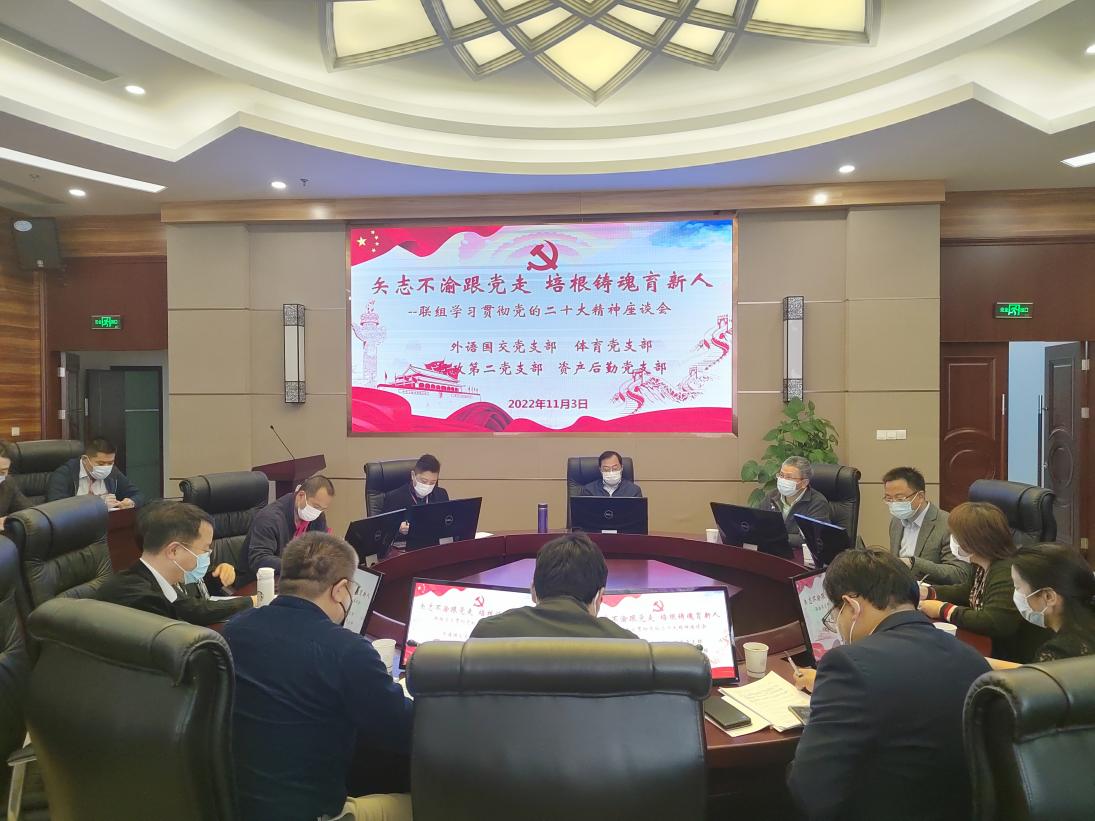 为深入学习宣传贯彻党的二十大精神,外语国交联合直属党支部、体育教学部直属党支部、行政第二联合直属党支部、资产后勤联合直属党支部于11月3日下午在北苑1号楼110室举行了以 “矢志不渝跟党走 培根铸魂育新人” 为主题的联组学习座谈会。副校长陈小冰作为联系单位校领导与会交流领学,会议由外语国交联合直属党支部书记吕永红同志主持。
