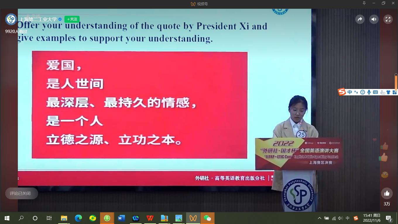 本届“外研社·国才杯”全国大学生英语演讲比赛激烈,在校赛中杨孟婷同学力压学校近200名参赛选手脱颖而出,以身边之事感受中国智慧,从亲历中国铁路变迁的角度讲述了中国高铁技术的发展。在指导教师的建议下,她成功地在演讲中描绘了金山铁路悄无声息的为百姓包括她的生活带来的便利,体现了中国铁路真正以民为本、与民方便的高科技的厚度与温度。她的演讲质朴坚实,用最真实的语言反映了中国智慧的科技之力、亲和之力,实属难得的佳作。尤其在即兴演讲环节,杨孟婷同学从全球视野的视角出发,完美地解答了爱国是人世间最深层、最持久的情感,也是一个人的立德之源、立根之本。在与复旦大学、同济大学、上海交通大学等20多所高校学子的激烈比拼中,她沉着冷静、应对从容,表现出以题为端、以赛为径,初心如炬、使命如磐的健康人风采。