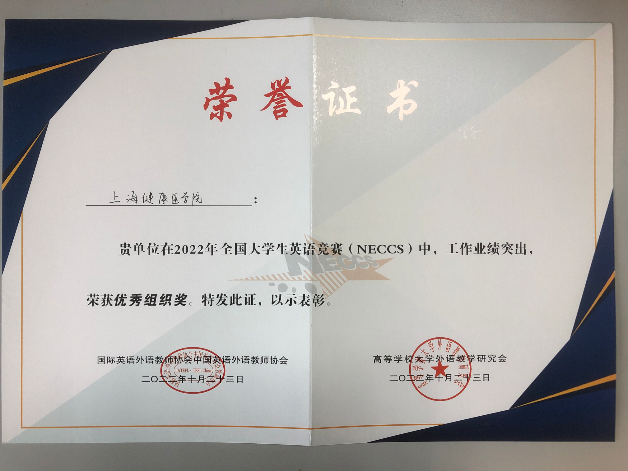 近日,我校组织学生参加了教育部高教司批准举办的全国大学生英语竞赛。该赛事为目前全国唯一的综合性国家级英语竞赛,仅上海就有包括交大、华师大、上外在内的40所高校参加了本届竞赛。经过初赛和决赛两轮角逐,我校临床医学院王嘉阅、杨毅、盛欣玥;护理与健康管理学院苗彭恺、华裔洁;医学技术学院顾怡蕾、顾芸菲;康复学院周颖仪、薛奕蕾;药学院李哲等10位同学获本科组全国一等奖,药学院计妍同学获高职组全国一等奖。我校另有55位同学分获本科组及高职组全国二等奖;92位同学分获本科组及高职组全国三等奖。上海健康医学院获优秀组织奖。