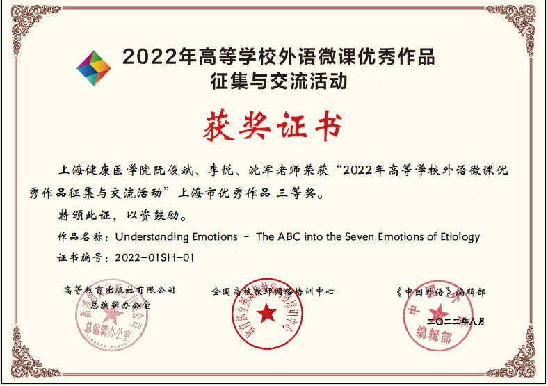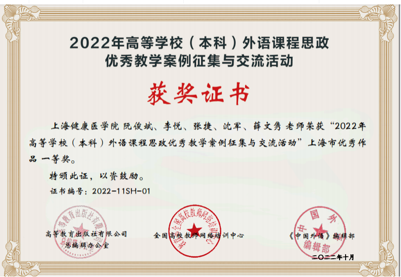 近日,我校阮俊斌、李悦等教师团队最终获得2022年外语课程思政优秀教学案例全国交流活动上海市一等奖、微课三等奖的好成绩。