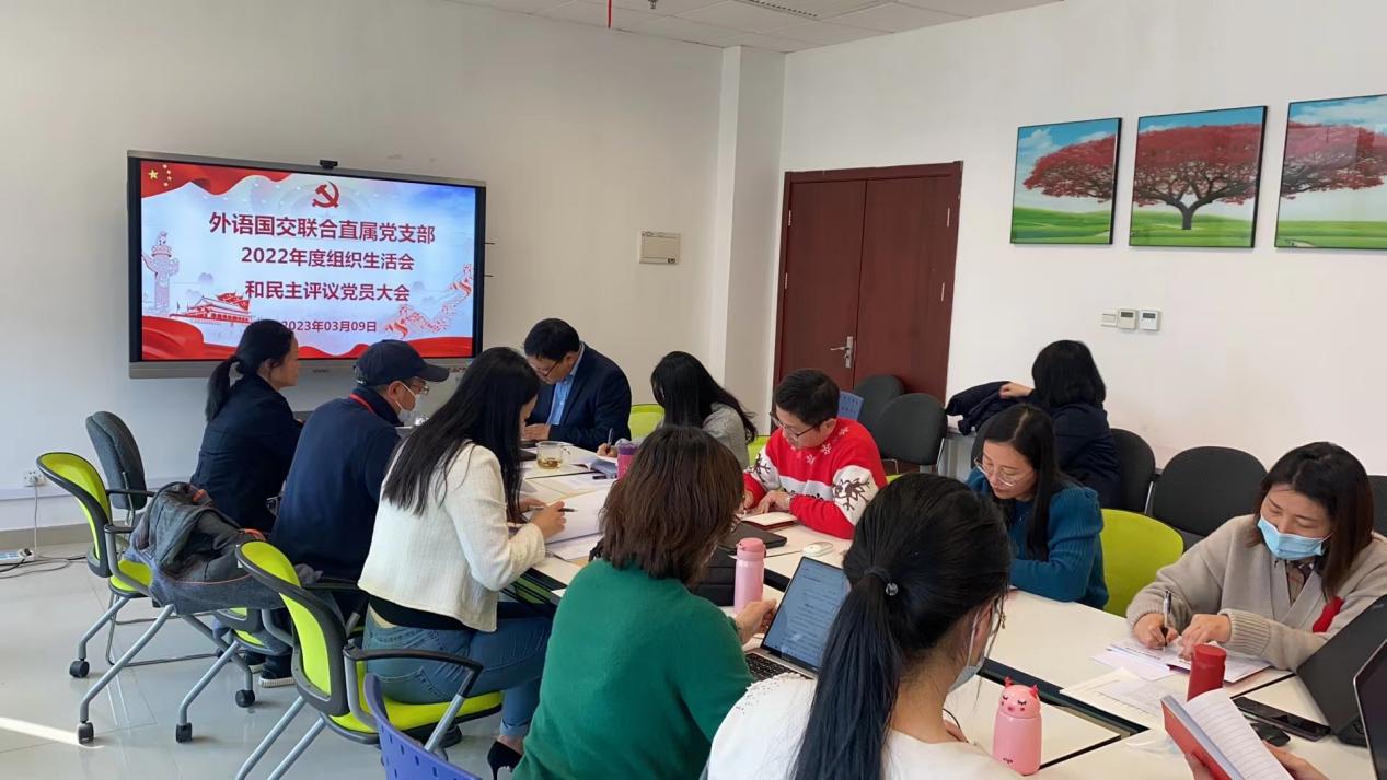 2023年3月9日下午,外语国交联合直属党支部组织全体党员在南苑2号楼401室召开2022年度组织生活会和民主评议党员大会,会议由支部书记吕永红同志主持。