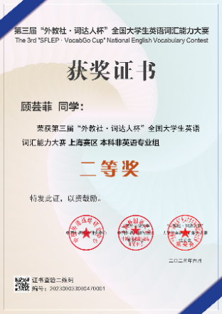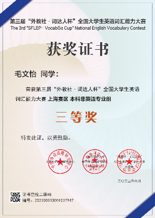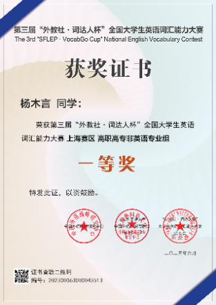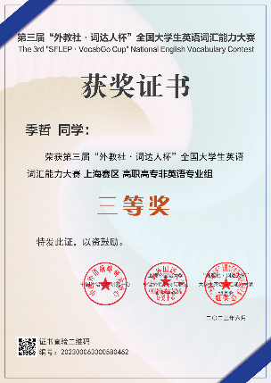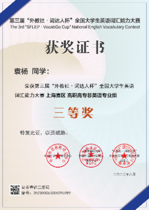 2023年3-5月,在教务处的指导下,外语教学部共组织我校1061名本科、专科学生报名参加第三届“外教社·词达人杯”全国大学生英语词汇能力大赛,取得参赛以来最佳成绩,荣获市赛一等奖1项、二等奖2项,三等奖4项,1人晋级国赛。在与复旦大学、上海交通大学、上海外国语大学等沪上高校的角逐中,我校医疗器械学院学生杨木言荣获上海赛区一等奖并入围国赛,医学技术学院学生顾芸菲、护理与健康管理学院刘静优分别荣获上海赛区二等奖,医学影像学院学生沈怡晨、毛文怡,医疗器械学院袁杨、季哲分别荣获上海赛区三等奖。外语教学部王宗忠、郑德虎、顾维芳、沈旭、翁洁、许秋红老师荣获优秀指导老师奖。