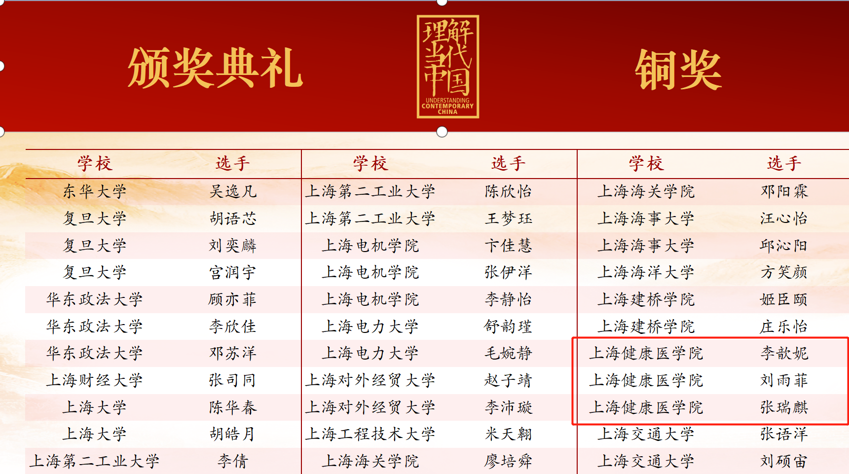 11月4日,在上海交通大学承办的外研社·国才杯“理解当代中国”全国大学生英语演讲比赛中,我校来自健康与公共卫生学院张瑞琪、医学技术学院刘雨菲、临床医学院李歆妮3名同学,以娴熟流畅的英语演讲阐述并体现了当下大学生理解当代中国的科学创新担当、融合全球理念、畅想未来发展的思想,在与高手聚集的专业参赛选手共同竞技中摘得铜奖,我校外语教学部阮俊斌、李悦、张帆、赵学旻、沈军等获得教师指导奖。