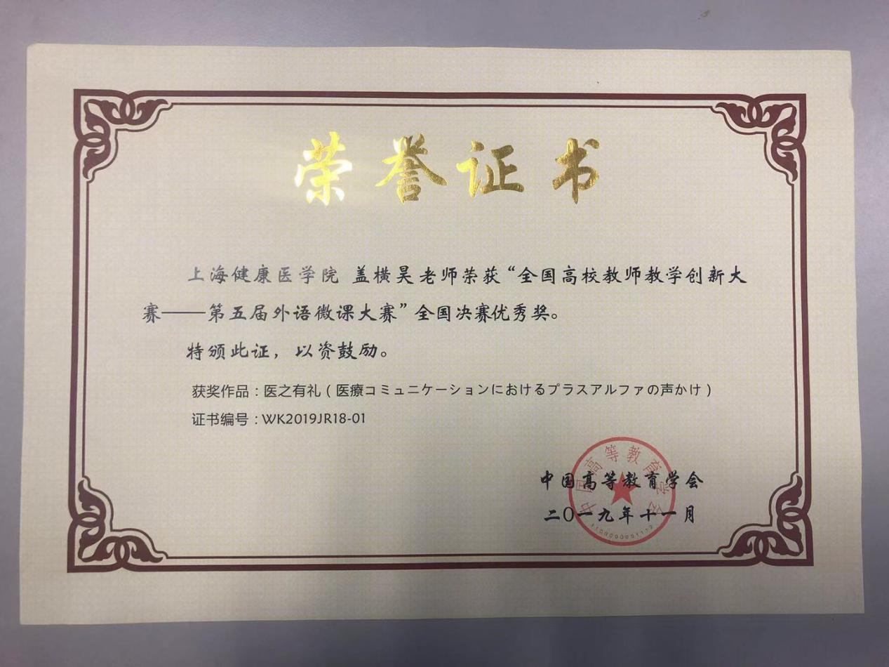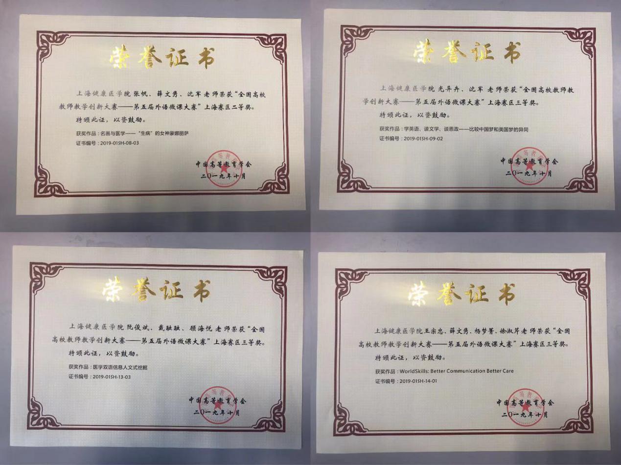 在本次比赛中,外语教学部的作品充分体现了集体优势和团队智慧。盖横昊老师作品《医之有礼》获得全国决赛优秀奖,该作品主要教授使用日语进行医患沟通的基本理念,使用日语寒暄用语进行医患沟通的表达方式与技巧。张帆老师作品《名画与医学-“生病”的蒙娜丽莎》获得上海赛区二等奖,该作品通过让学生对医学名画的欣赏和观察,引入名画艺术背后医学的变迁、疾病诊治的故事,引导学生在艺术中寻找灵魂共鸣,领悟和培养仁爱之心,思考医学以及医患沟通中的人文关怀,培养未来与病人在各个层面进行良好沟通的能力。阮俊斌老师作品《医学双语信息人文式挖掘》获得上海赛区三等奖,该作品诠释了如何在医学翻译项目管理中利用信息技术查找文献、搜索信息,并应用于医学文本的翻译,使文字表述精准、实用,可操作性强。王宗忠老师作品《World Skills:Better Communication Better Care》获得上海赛区三等奖,该作品旨为世界技能大赛“健康与社会照护”选手进行医护英语培训的部分凝练,重点探讨如何以医学人文语言交流来提高健康照护的质量。引导学生将医患沟通技巧应用到临床实践,培养其成为有温暖、有情感、有同理心的新时代医务工作者。光异卉老师作品《学英语、读文学、谈思政-比较中国梦和美国梦的异同》获得上海赛区三等奖,该作品将思想政治教育融入到大学英语教学中,探讨中国梦和美国梦的异同,并通过阅读文学经典,加深对上述概念的理解。从而激发学生努力奋斗追求梦想。