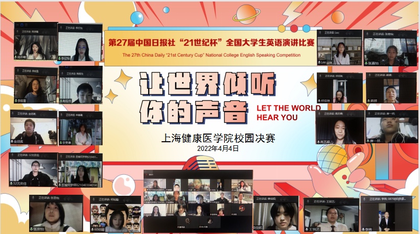 根据学校本科教学合格评估要求,全面提高高等教育质量,促进我校英语学科教育发展,营造浓郁的英语学术氛围,展现当代大学生风采,上海健康医学院教务处、外语教学部承办了第27届“21世纪杯”全国大学生英语演讲比赛上海健康医学院校园选拔赛。