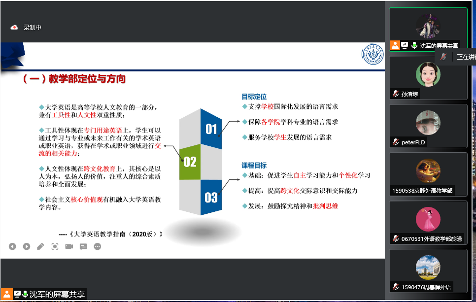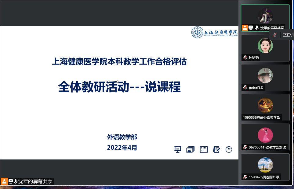 为进一步配合2022 年本科教学合格评估工作有序有效开展,疫情防控期间,外语教学部在4月21日中午利用腾讯会议平台线上召开全体教研活动,本次主题为“说课程”,全体教师、各教研室主任、教学部督导等悉数参加,会议由副主任沈军主持。