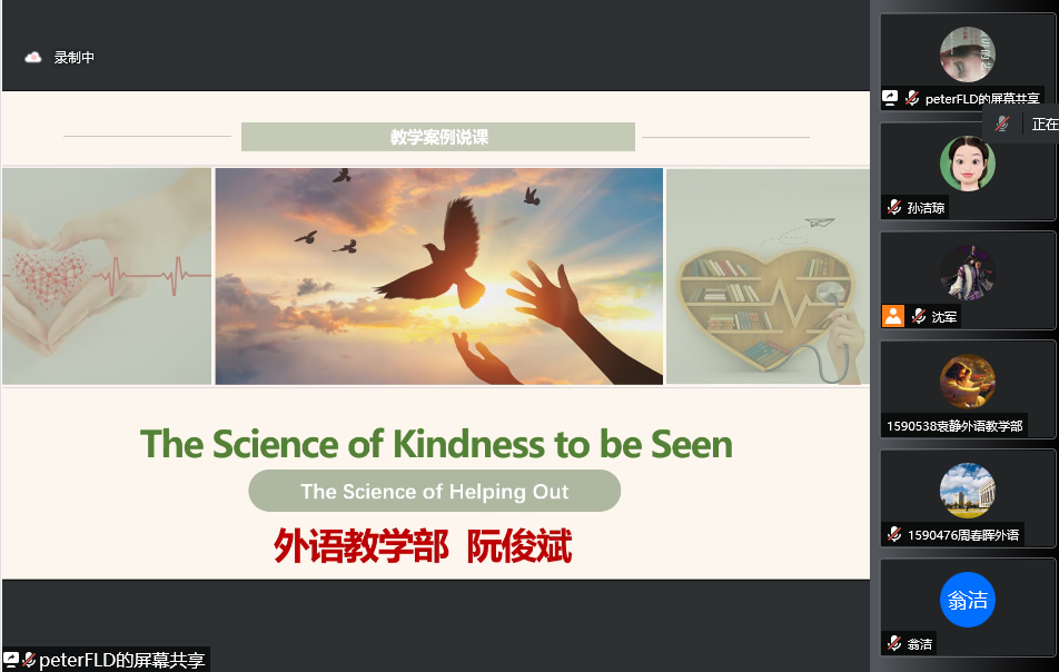 阮俊斌老师的The Science of Kindness to be Seen的说课曾获得2021 年外语课程思政优秀教学案例全国交流活动一等奖,该门课使用《新时代明德大学英语》教材,以素材“The Science of Helping Out”为题,精心打造教学案例,全程阐释了社会主义核心价值观之一、中华民族崇尚“友善”的优秀品质。阮老师在说课中,引用具有说服力的事实,以独创的3D教学方式定位教师的脚手架作用、发挥学生学习的主体功能,帮助学生深刻理解施善者角色互换的重要意义,让学生明白其实‘守护’的故事,渗透着无私的个人担当和社会责任,是发生在我们身边的故事,在疫情期间暖心和善意放大了,也让上海这座城市更为温暖,具有现实教育意义。