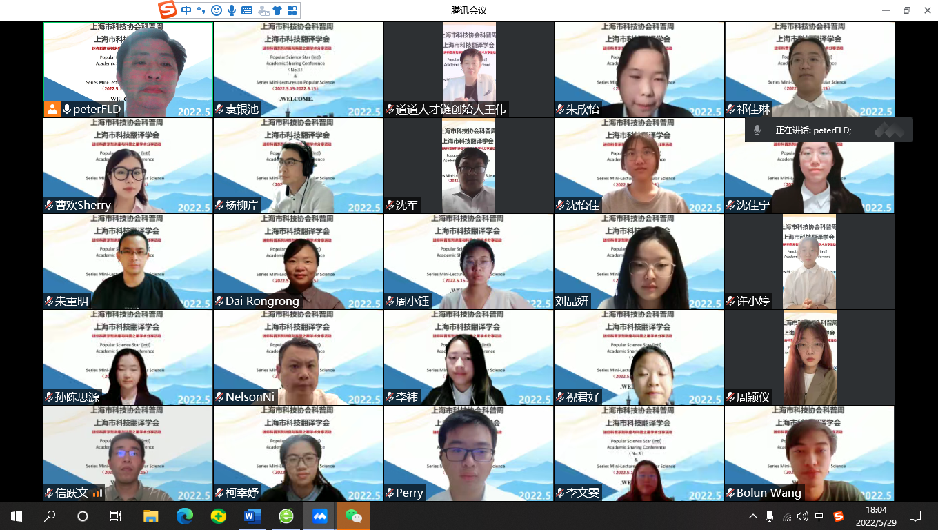 2022年5月期间,在由上海市科技协会指导的“全国科技者工作日”的重要活动,暨第三期科普之星线上学术分享活动中,上海健康医学院外语教学部和临床医学院师生分享了精彩纷呈的科普成果,获得各方好评。
