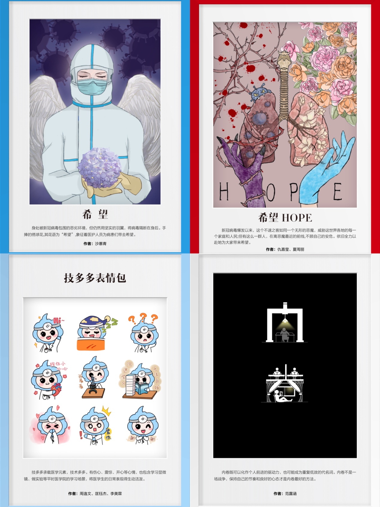 在由上海市教育委员会主办的第七届“汇创青春”—上海大学生文化创意作品展示活动“视觉传达设计类”比赛中,外语教学部陆懿媛教师团队继去年在本项赛事中获得优异成绩之后,再次带领团队组织学生参赛。本次参赛作品从数量上、质量上大幅提升。2020级学生仇嘉莹,夏周丽作品《希望HOPE》、2019级学生沙蕙青作品《希望》、2019级学生周逸文、匡钰杰、李美霖作品《技多多》、2019级学生范露涵作品《内卷》从618件作品中脱颖而出,晋级终评并获得上海市三等奖。